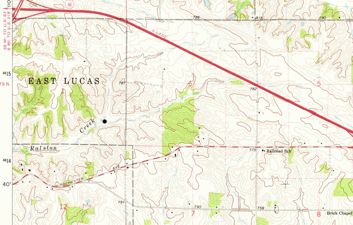 The topography east of Iowa City 1965 is shown in the USGS 7.5 minute Topo Map (Iowa City East Quadrangle). Use this map to delineate the drainage divide (or watershed) of a headwater tributary to the North Branch Ralston Creek. The outlet of the watershed is indicated by the black circle.